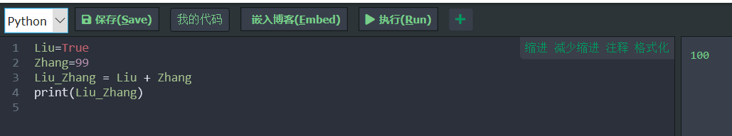 布尔的True值在和整数一起运算的时候,就自动转换为整数的1,所以相加会等于100,如下图: