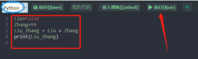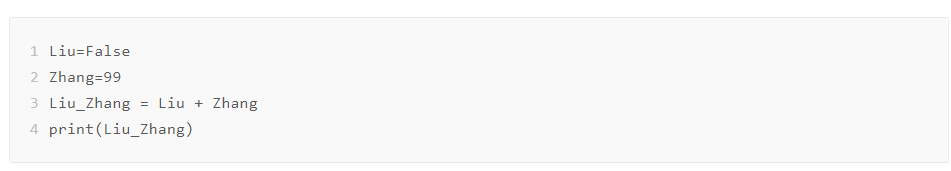 布尔类型可以隐式自动转换为整数类型和浮点类型。这一例子中,Zhang=99,是整数,布尔的False值在和整数一起运算的时候,就自动转换为整数的0,所以相加等于99。