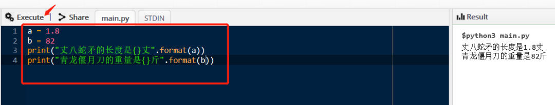 如图所示,输入代码后,点击执行。(注意:如图椭圆框所示,要选择使用Python)